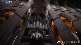 在大教堂的墻壁上,一張巨大的光網(wǎng)逐漸成型,隨后消失,變成了一個不斷變化的世界。