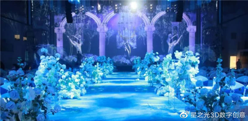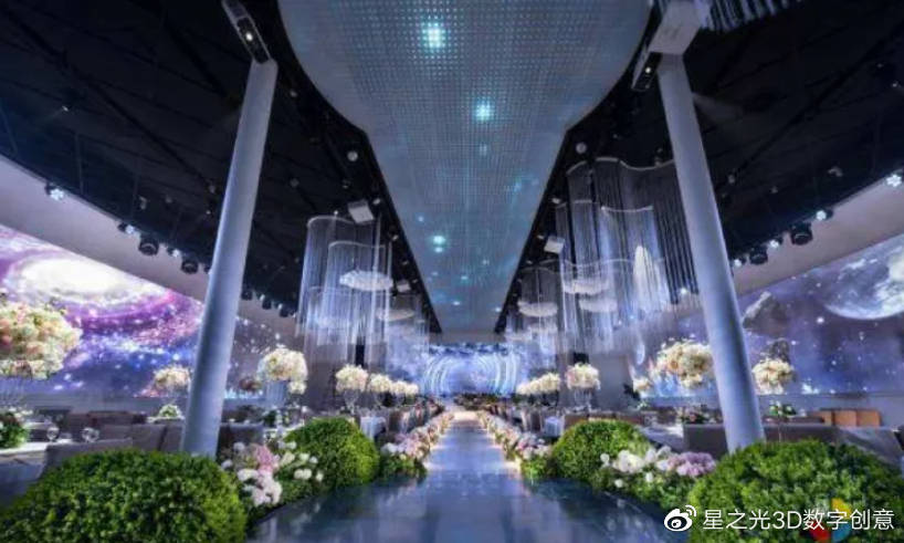 5D立體影像和其他高科技的結(jié)合,打造出一種如夢(mèng)似幻的婚禮現(xiàn)場(chǎng)!鮮花、海水、城堡、星空等主題的隨意展示,給人以強(qiáng)烈的視覺(jué)沖擊。