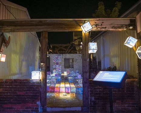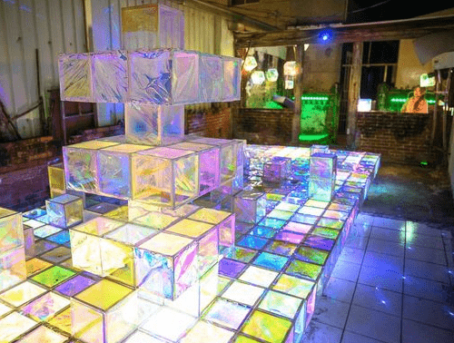 走進廢墟裡,地板整齊排列著繽紛的方塊,這些方塊體看起來是用玻璃紙去設計的,摸起來輕薄,所以不可以坐在作品上。冰晶方塊魅力四射,再搭配燈光的照射,滿分覺得好像來到璀璨的冰晶殿堂,月之故事館的幻彩結晶也非常受歡迎。